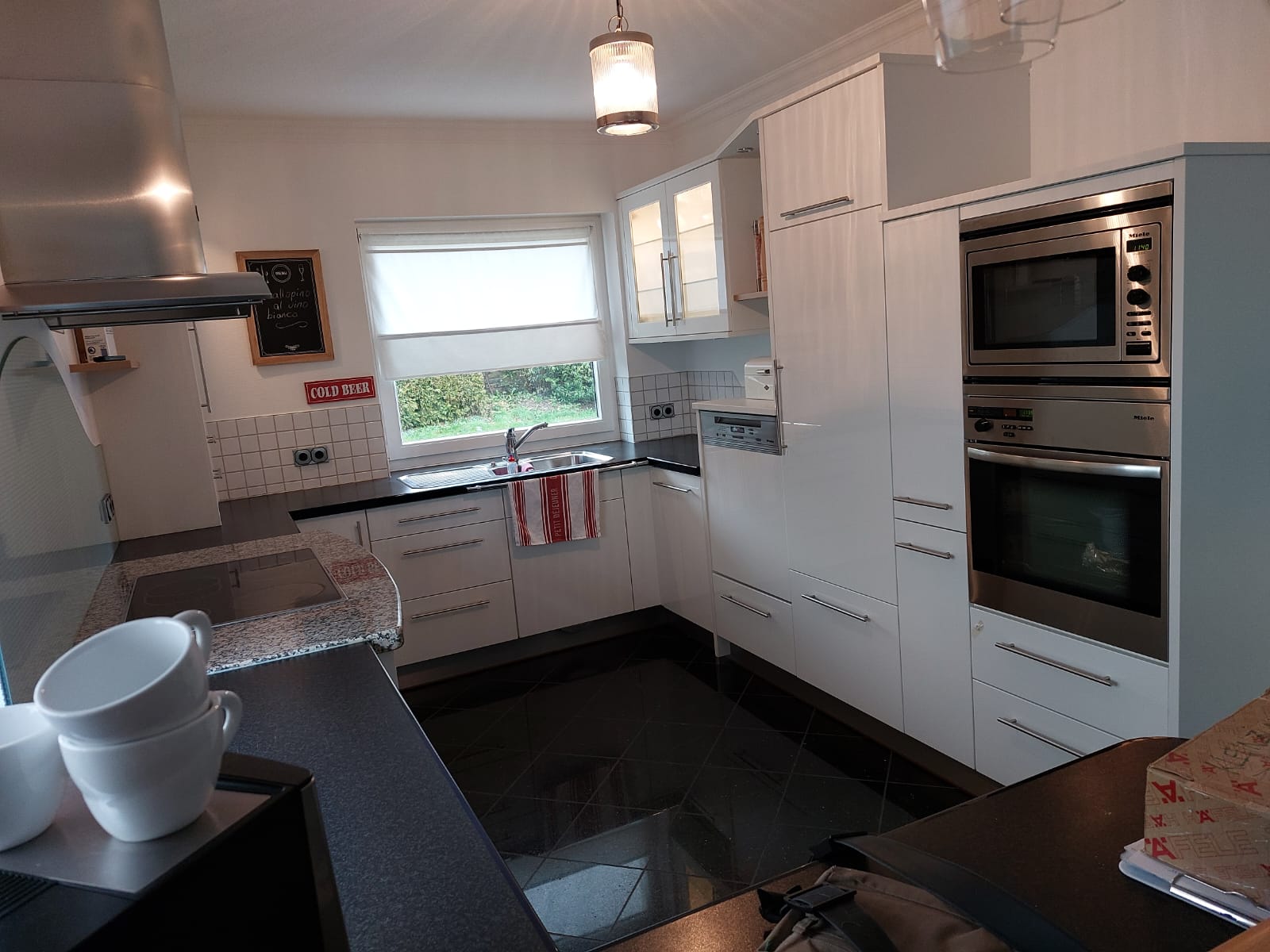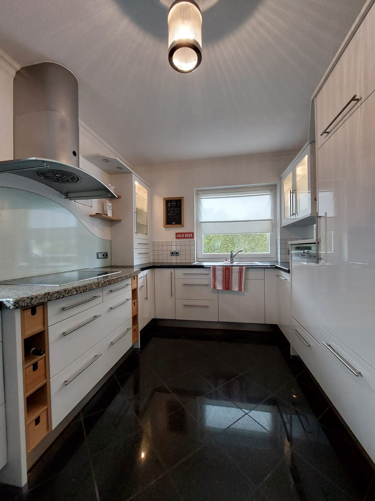 zügen. Alle Fronten sind sanft schließend. Die Schrankfronten aus Ahorn-Tischlerplatte, mit fortlaufendem Furnierbild- für